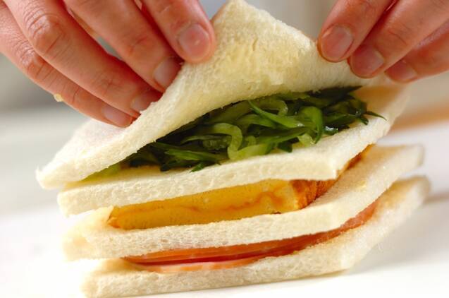 食パン4枚は両面にマヨネーズをぬり、残り4枚は片面にマヨネーズをぬる。食パン、ハム、食パン、<厚焼き卵>、食パン、キュウリ、食パンの順に半量ずつのせ、サンドする。残りも同様にサンドする。