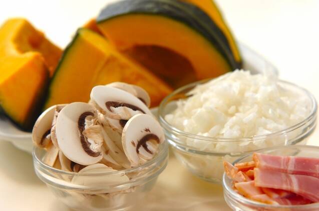 玉ネギはみじん切りにする。マッシュルームは薄切りにする。べーコンは幅1cmに切る。カボチャは種とワタを除き、4等分に切る。