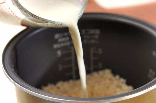 炊飯器にお米を入れ、分量線まで牛乳を加える。顆粒スープの素を入れて混ぜたら、<ミルクピラフ>のその他の材料をのせて炊く。