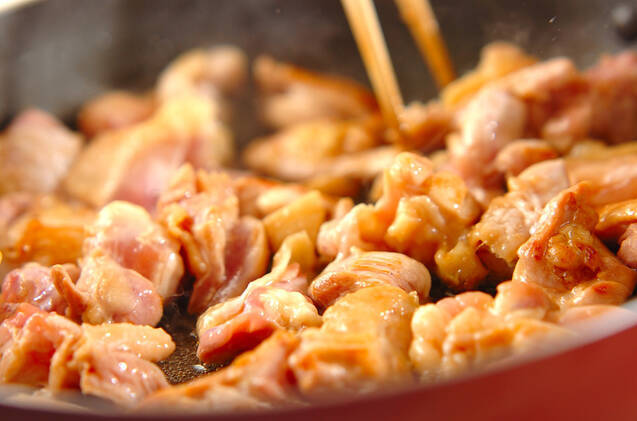 フライパンにサラダ油を熱し、キッチンペーパーで汁気を軽く拭いた鶏もも肉を入れ、両面こんがり焼く。
