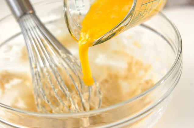 バターを泡立て器でクリーム状になるまでよく混ぜ合わせ三温糖を加えてしっかり混ぜ合わせる。溶きほぐした卵を少しずつ加えてその都度混ぜ合わせ、さらにメープルシロップを混ぜる。