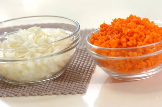 玉ネギはみじん切りにする。ニンジンは皮をむいて細かいみじん切りにする。<調味料>材料を混ぜ合わせる。