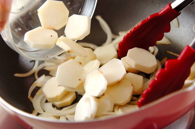 (2)のフライパンを洗わずに玉ネギを入れてしんなりするまで炒める。里芋も加え、全体に油をなじませる。
