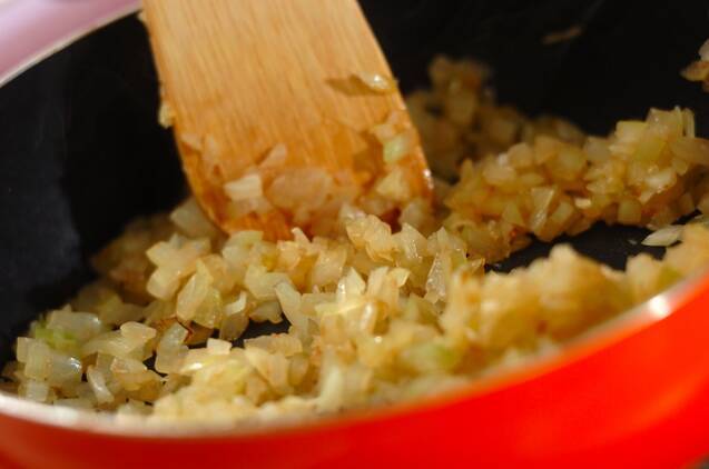 玉ネギは5mm角の粗みじん切りにし、分量外のサラダ油を熱したフライパンで炒め、分量外の塩ひとつまみを加えてさらにしんなりするまで炒め、バット等に取り出して冷ます。