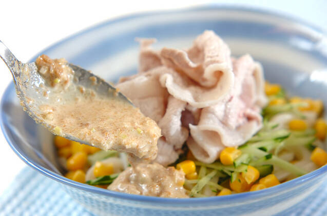 器にうどんを盛り、(1)の豚肉、キュウリ、プチトマト、水煮コーンを盛り合わせ、<ゴマ酢ダレ>をかける。お好みでラー油をかけて下さい。