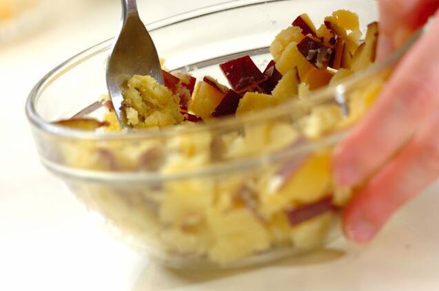 鍋にサツマイモと水を入れ、竹串が刺さるまでゆでる。ザルに上げて水気をきり、熱いうちに粗くつぶす。