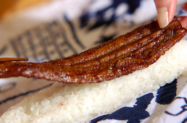 巻きすに堅く絞った布巾を広げて、ご飯を手で棒状にまとめ、布巾にのせてウナギの大きさに合わせて布巾で形を整え、ウナギをのせる。ウナギにラップをかけ、布巾と巻きすで形を整えながら巻き、ご飯とウナギをなじませる。