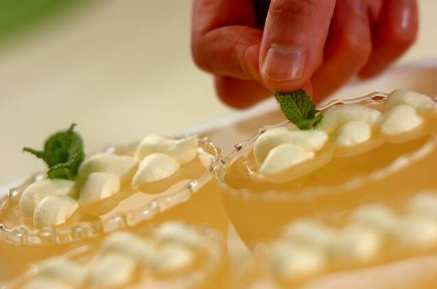 生クリームの上に、ピンクペッパーとミントの葉を飾る。