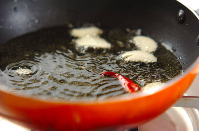 フライパンにニンニク、赤唐辛子、オリーブ油を入れて火にかける。