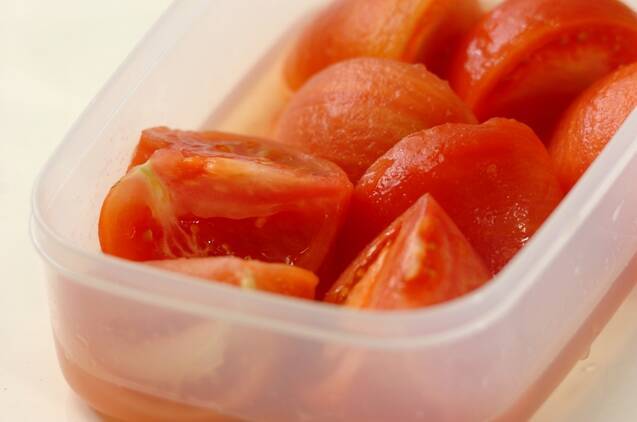トマトはヘタをくり抜き、熱湯にくぐらせて水に取り、皮をむいて4つのくし切りにし、<合わせだし>に入れ、冷蔵庫で2時間以上置く。