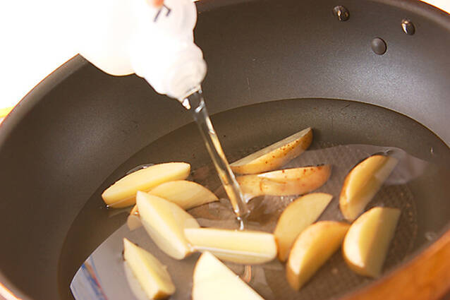 深めのフライパン、又は中華鍋にジャガイモを入れ、常温の揚げ油(後で手羽元を揚げるので、少し多め)を注ぎ入れる。強火にかけ、ジュワジュワ泡が立ってきたら、中火にする。