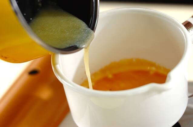 別の鍋に砂糖を入れて中火で加熱する。茶色く色づいたら、火を止めて(1)を半量ずつ加え混ぜる。