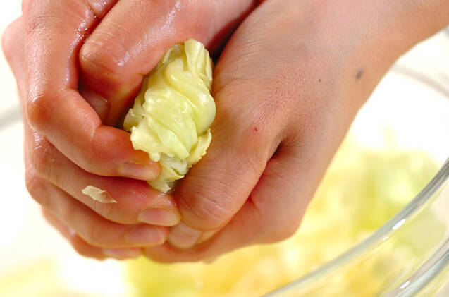 キャベツはひとくち大に切り、耐熱皿に入れてラップをかけ、電子レンジで3~4分加熱し、粗熱が取れたら水気を絞る。電子レンジは600Wを使用しています。