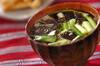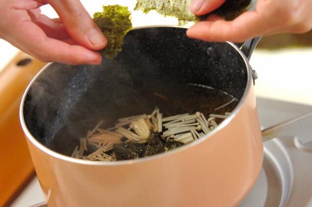 煮たつ直前に焼きのりを手でちぎりながら入れ、細ネギを加えて火を止める。塩で味を調え、器に注ぐ。