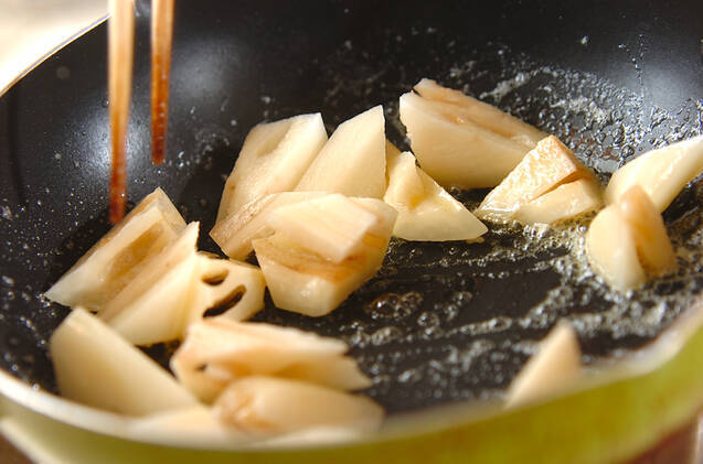 フライパンにバターを中火にかけ、バターが溶けたら、レンコンを炒めてしょうゆで味を調え、器に盛る。