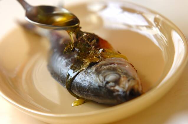 器に盛り、タイムを取り出して飾り、EVオリーブ油をかける。