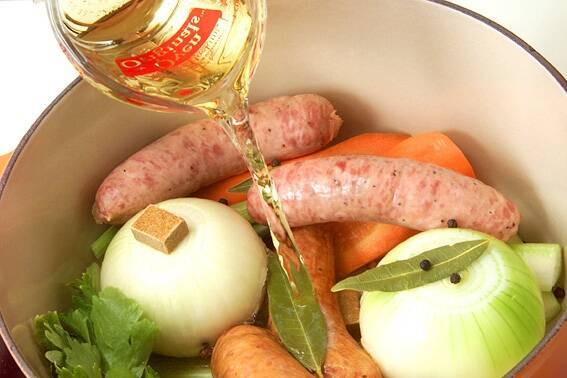 大きめの煮込み鍋に、ソーセージ、玉ネギ、ニンジン、セロリ、ローリエ、<合わせスープ>を入れ強火にかけ、煮立てばアクを取り、弱火にして蓋を少しずらせてかけ、50分位コトコト煮込む。