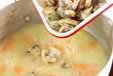 玉ネギがしんなりすれば、小麦粉を加え、粉っぽさがなくなるまで炒め合わせ、固形ブイヨン、水を加える。煮立てば火を弱め、ジャガイモが柔らかくなるまで10分位煮て、アサリを加える。