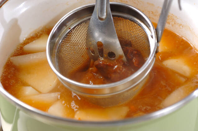 カブが透き通って柔らかくなったら豚肉を加え、火が通ったらみそを溶き入れて火を止める。ゆでたカブの葉を適量加えてひと混ぜし、器に注ぎ入れる。