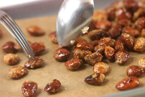 再び中火にかけ、混ぜながら砂糖が溶け、キツネ色のカラメルになればバターを加えてよく混ぜる。熱いうちにオーブンシートにくっつかないように1粒ずつ広げ、冷ます。