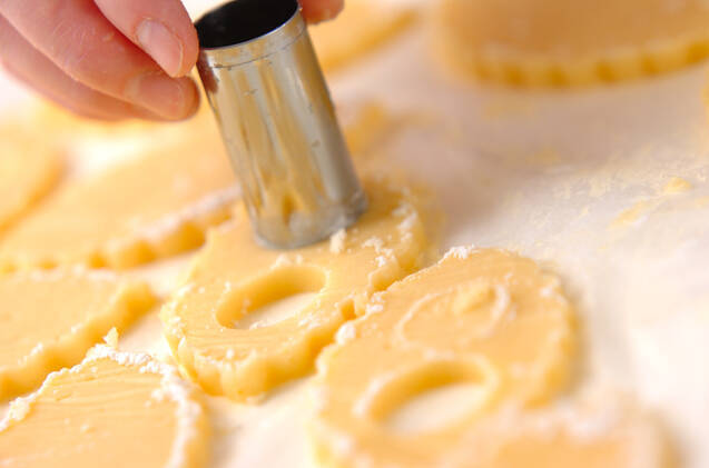 リーフのクッキー型で生地を抜く。(偶数枚)2枚セットの1枚を目玉状に円く2つ穴を開ける。