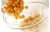 ヒヨコ豆はザルに上げ、水気をきる。サーモンはひとくち大に切る。ボウルに<ドレッシング>の材料を混ぜ合わせ、ヒヨコ豆、サーモンを合わせる。
