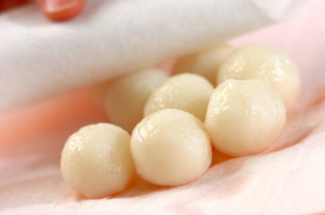 白玉を8個に丸めて熱湯に入れ、浮いてきたらそのまま2分ゆで、冷水に取る。冷めたらキッチンペーパーの上にのせ、水気をきる。