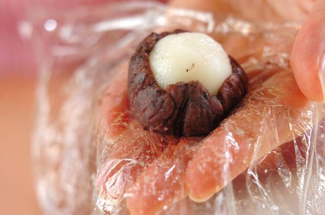ラップにこしあんを少し広げてのせ、(1)を真ん中に置き、ラップごと白玉団子が半分位包まれるように形を整える。