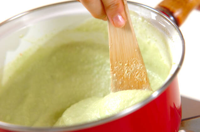 中火にかけて混ぜながら、少しトロミがついてきたら弱火にしてしっかり混ぜながらよく練る。