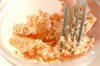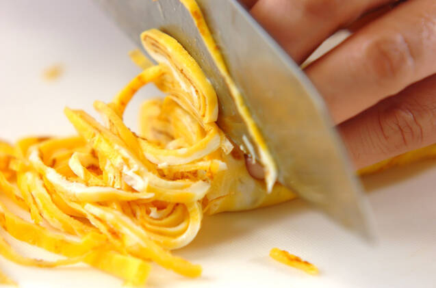卵が乾いた状態になったら、ひっくり返してサッと焼き、まな板に広げて冷ます。長さ4cmのせん切りにする。