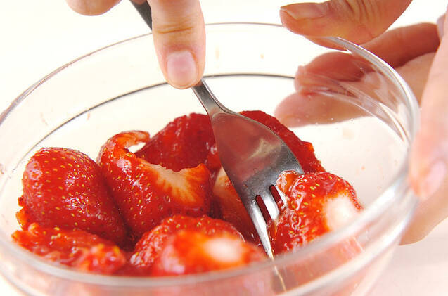 イチゴはきれいに水洗いし、水気を拭き取る。ヘタを取ってフォークで粗くつぶす。
