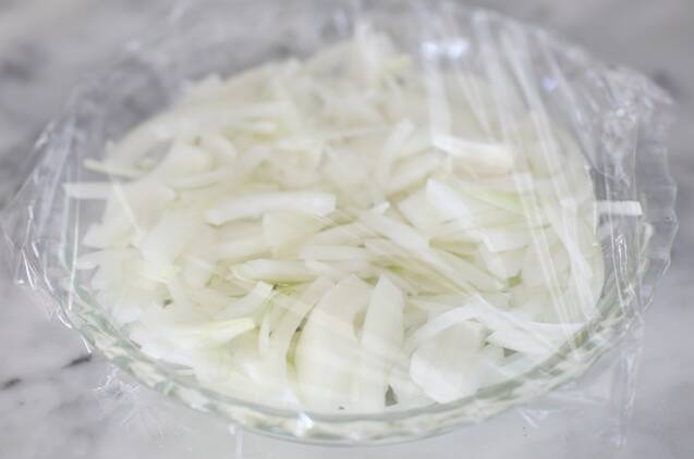 玉ネギは皮をむき、薄切りにします。耐熱皿に入れ、ふわりとラップをし、電子レンジで4分加熱します。