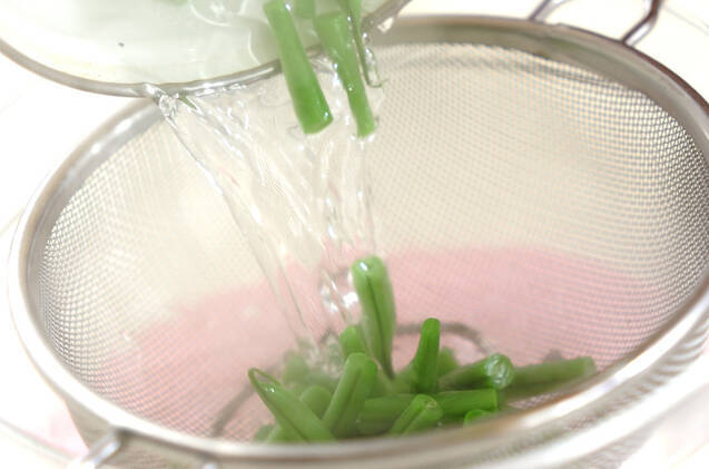 塩を入れた熱湯にサヤインゲンを入れ、煮たったら1~2分位ゆでてザルに上げる。