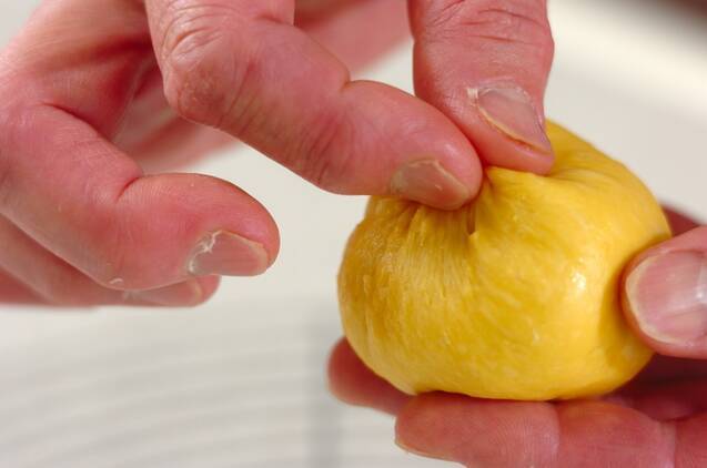 <成形する>閉じ目を上にして全体を手のひらで押さえ、<マンゴークリーム>、クリームチーズを置き、つまんで閉じる。とじ目を下にして型に入れ、上から軽く押さえる。