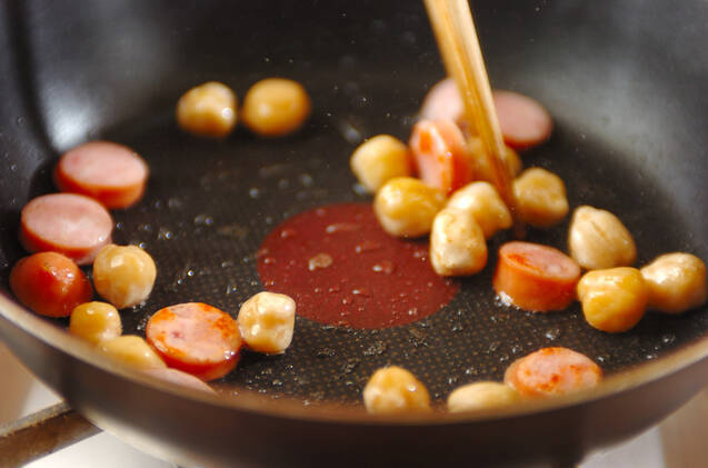 フライパンのサラダ油を熱し、ヒヨコ豆とソーセージをよく炒め、塩コショウ、しょうゆを加えて炒め合わせる。