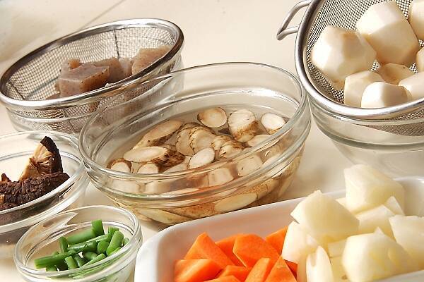 板コンニャクはひとくち大にちぎり、鍋に水と共に入れて中火にかけ、煮たったら1~2分ゆでてザルに上げる。(ヒント)アク抜き不要の板コンニャクの場合はゆでずに水洗いをしてください。