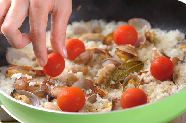 お米が透き通ってきたらローリエ、酒、湯を加え、煮立ってきたらフライパンの蓋をして中火で4~5分煮込む。弱火で水分が少なくなるまで約10~12分煮る。途中でアサリが口を開いたら塩コショウで調味し、プチトマトを並べ入れる。