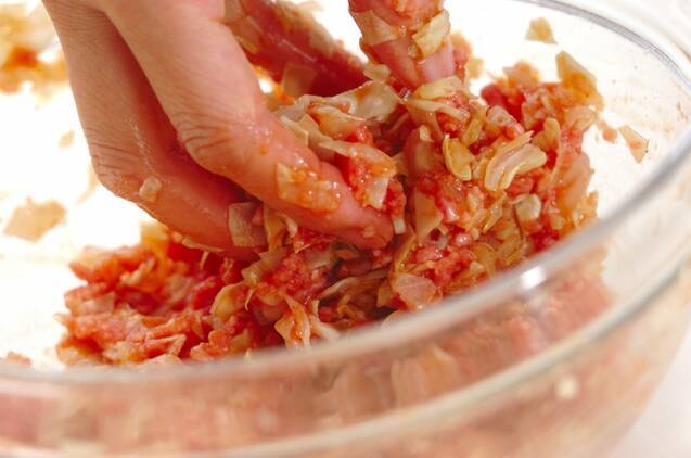 ボウルにキャベツ、合いびき肉、<調味料>の材料を加えてよく混ぜ、耐熱容器に2等分にして入れて表面をならす。