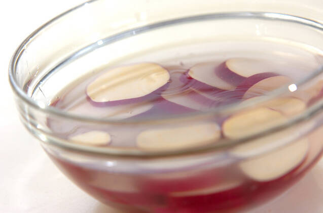 サツマイモは皮ごときれいに水洗いし、厚み1.5cmの輪切りにして水に放つ(細い場合は皮ごときれいに水洗いし、食べやすい長さの輪切りにして水に放つ)。