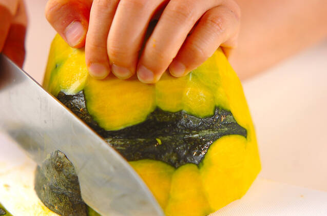カボチャは種とワタを取り、皮を薄く削ぎ落とし、ひとくち大に切る。水に通してぬれたまま耐熱容器に並べ、少し隙間をあけてラップをかけ、電子レンジで4~5分加熱する。電子レンジは600Wを使用しています。