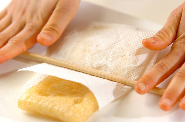 油揚げは熱湯を通して油抜きをし、半分に切る。キッチンペーパーにはさんで菜ばし等でコロコロ押さえて柔らかくし、袋状に開く。