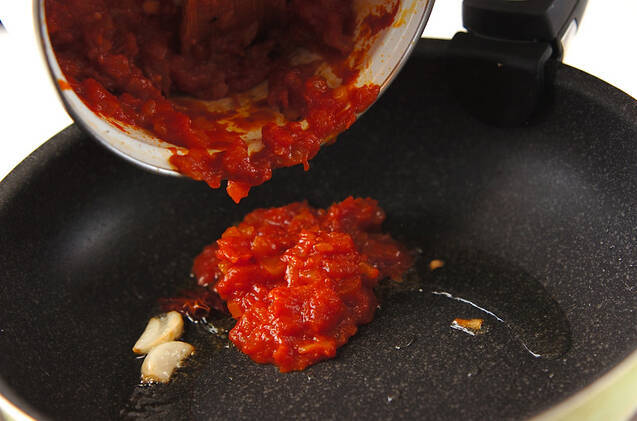 フライパンにオリーブ油大さじ1、ニンニク、赤唐辛子を入れ、弱火にかける。弱火でニンニクがキツネ色になるまで炒めて<トマトソース>を加え、味がなじんだら塩コショウで味を調える。