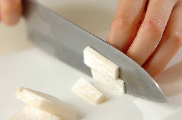 エリンギは長さを3等分に切り、さらに短冊切りにする。