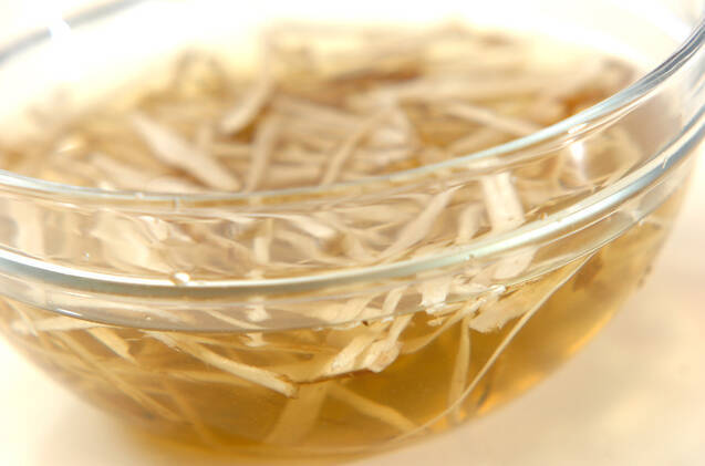 ゴボウはタワシできれいに水洗いし、ピーラーで薄くスライスして水に放ち、水気を拭き取る。