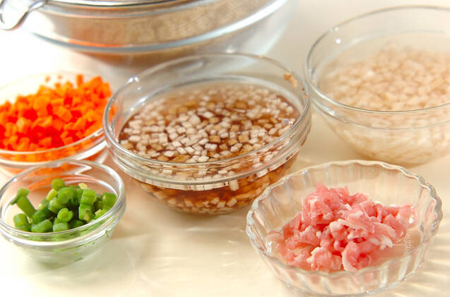 ゴボウはたわしできれいに水洗いし、みじん切りにして水に放つ。