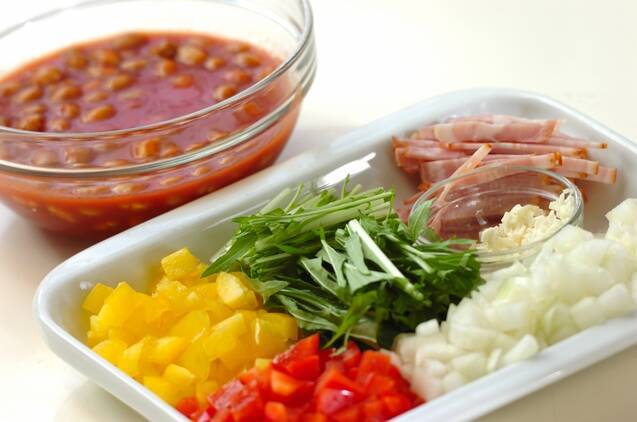 ベーコンは幅5mmに切る。玉ネギはみじん切り、赤、黄パプリカはヘタと種を取ってみじん切りにする。水菜は根を切り落とし、長さ5cmに切る。