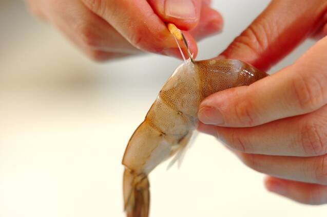 エビは殻と背ワタを取り除き、分量外の塩水で洗って水気を拭き、塩コショウ、白ワインを振る。ニンニクは芽を除き、みじん切りにする。