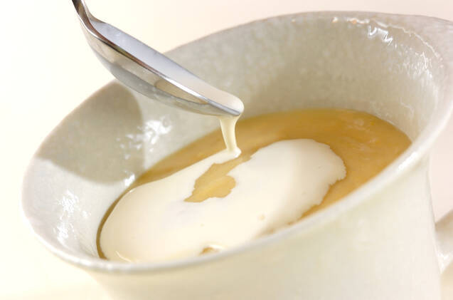 器に1を注ぎ、生クリームをかけて粗びき黒コショウ、ドライパセリを振る。