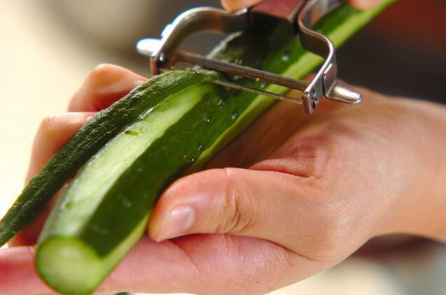 キュウリは縦じまに皮をむき、縦半分に切り、5mm厚さの斜め切りにする。塩をまぶして10分おき、水洗いしてザルに上げる。