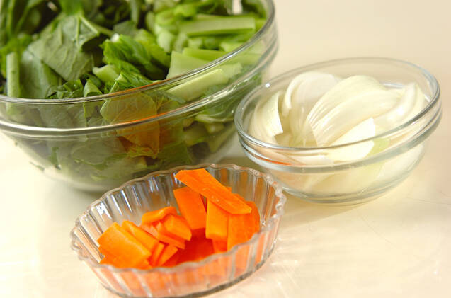 小松菜は根元を切り落とし、長さ2~3cmに切る。